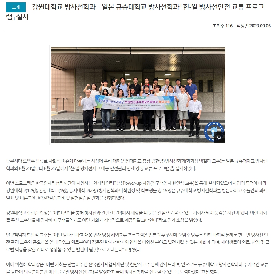 강원대학교 방사선학과·일본 규슈대학교 방사선학과 「한-일 방사선안전 교류 프로그램」 실시