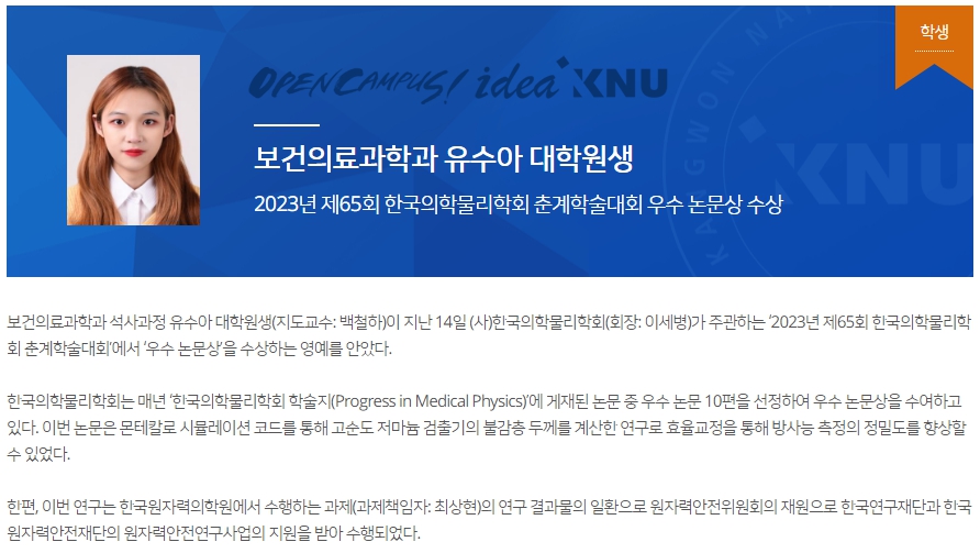 2023년 제65회 한국의학물리학회 춘계학술대회 우수 논문상 수상